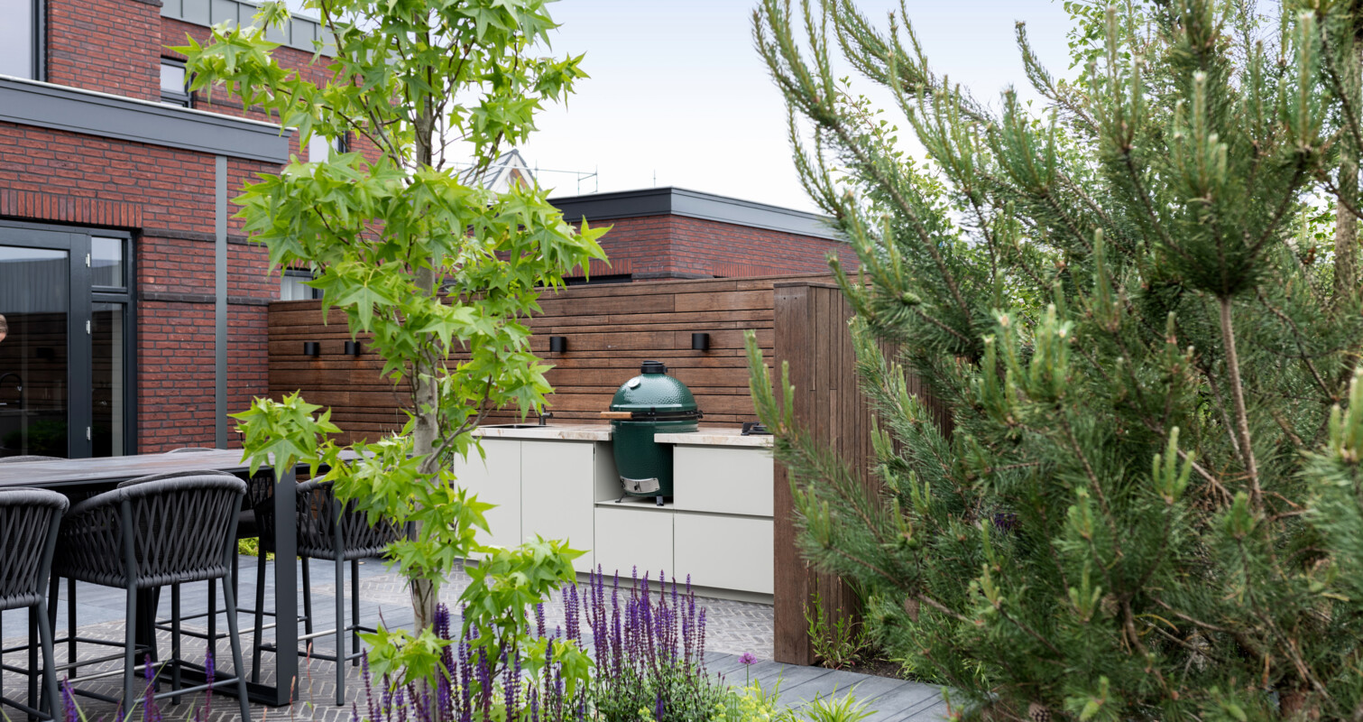 De perfecte balans tussen sfeer en ultieme luxe. Dat is bereikt in deze gezellige tuin met luxe buitenkeuken in Naaldwijk. Voor de klant hebben we hier een op maat gemaakte buitenkeuken gerealiseerd met een Big Green Egg barbecue, gaspitten van PITT cooking en een spoelbak met kraan. Kenmerkend aan de buitenkeuken is het excentrieke Dekton werkblad in combinatie met de warme kleur van de kasten. Deze combinatie past goed in de mediterrane sfeer van de tuin en vormt een warme combinatie met de houten achterwand.