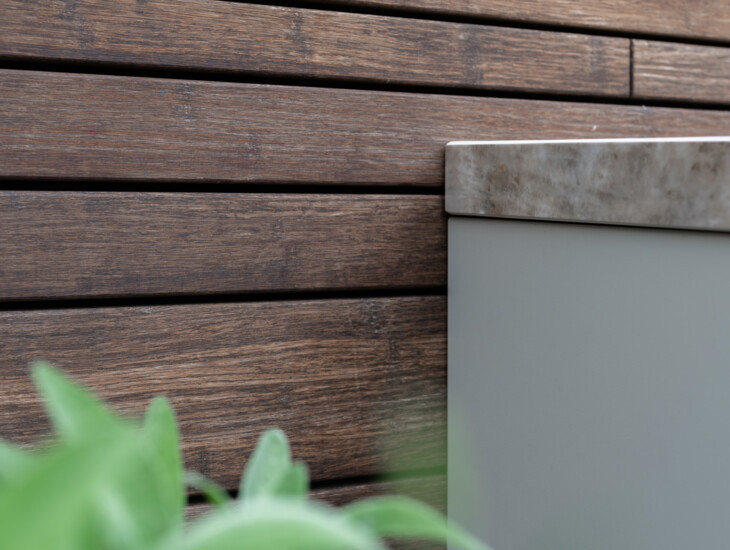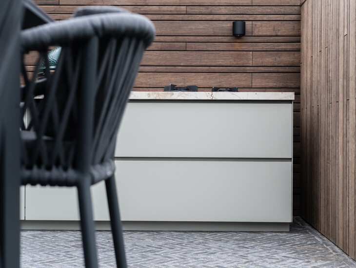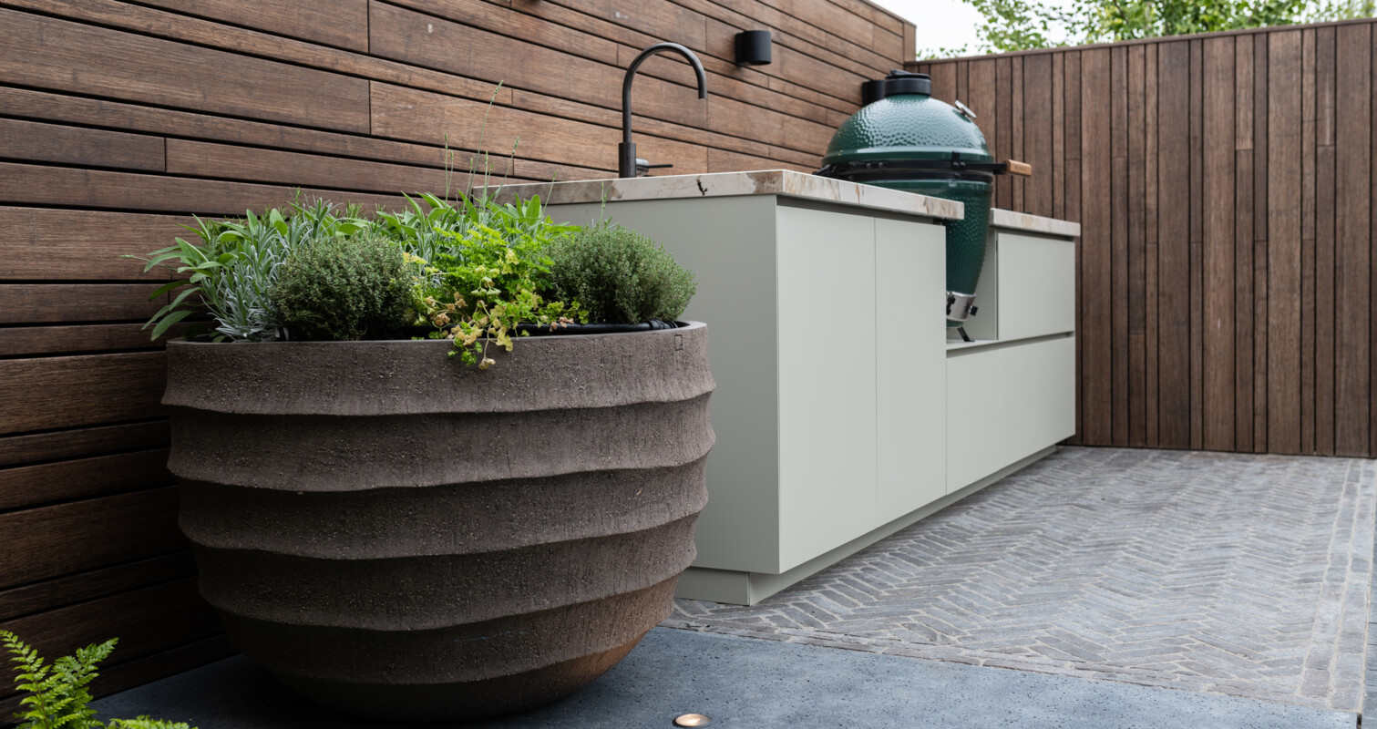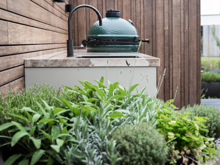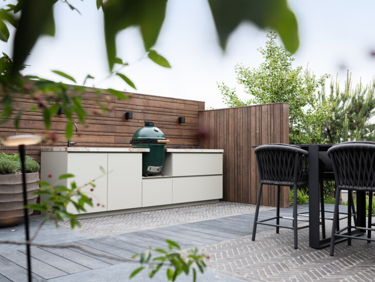 In het ontwerp van deze gezellige buitenkeuken is gekozen voor een kenmerkende combinatie van materialen. Het in een sfeervolle kleur gecoate aluminium vormt een mooie combinatie met het hoogglans Dekton werkblad. Deze combinatie is perfect afgestemd op de rest van de materialen in de tuin, zodat in het totale ontwerp een evenwichtige balans ontstaat.