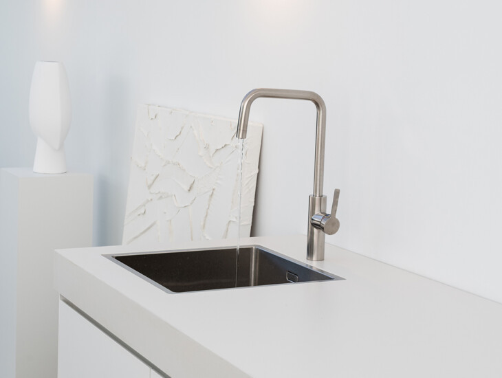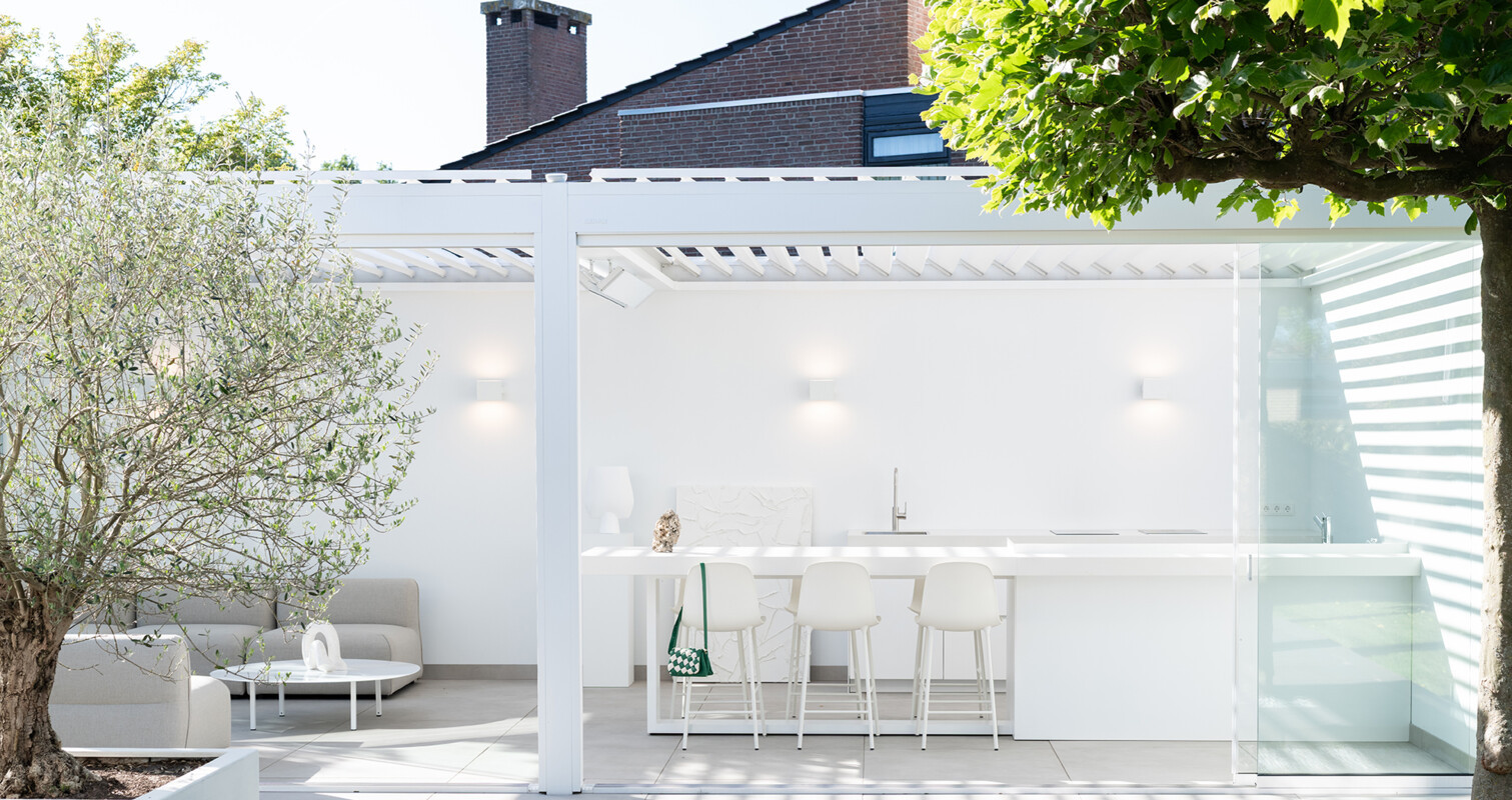 Tijdloosheid en rust zijn de basis van dit ontwerp. Er is gekozen voor een elegante witte basis die wordt versterkt voor de heldere lijnen. Het robuuste werkblad geeft de buitenkeuken met bar een geheel eigen karakter en zorgt voor een mooie balans in het gehele ontwerp