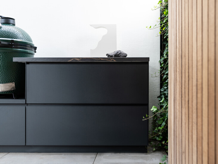 Het ontwerp van deze buitenkeuken kenmerkt zich door de kenmerkende, elementaire balans. Centraal staat de Big Green Egg Large opgesteld. De kasten van het meubel zijn symmetrisch vormgegeven, wat zorgt voor rust en eenheid in het ontwerp.