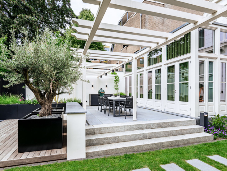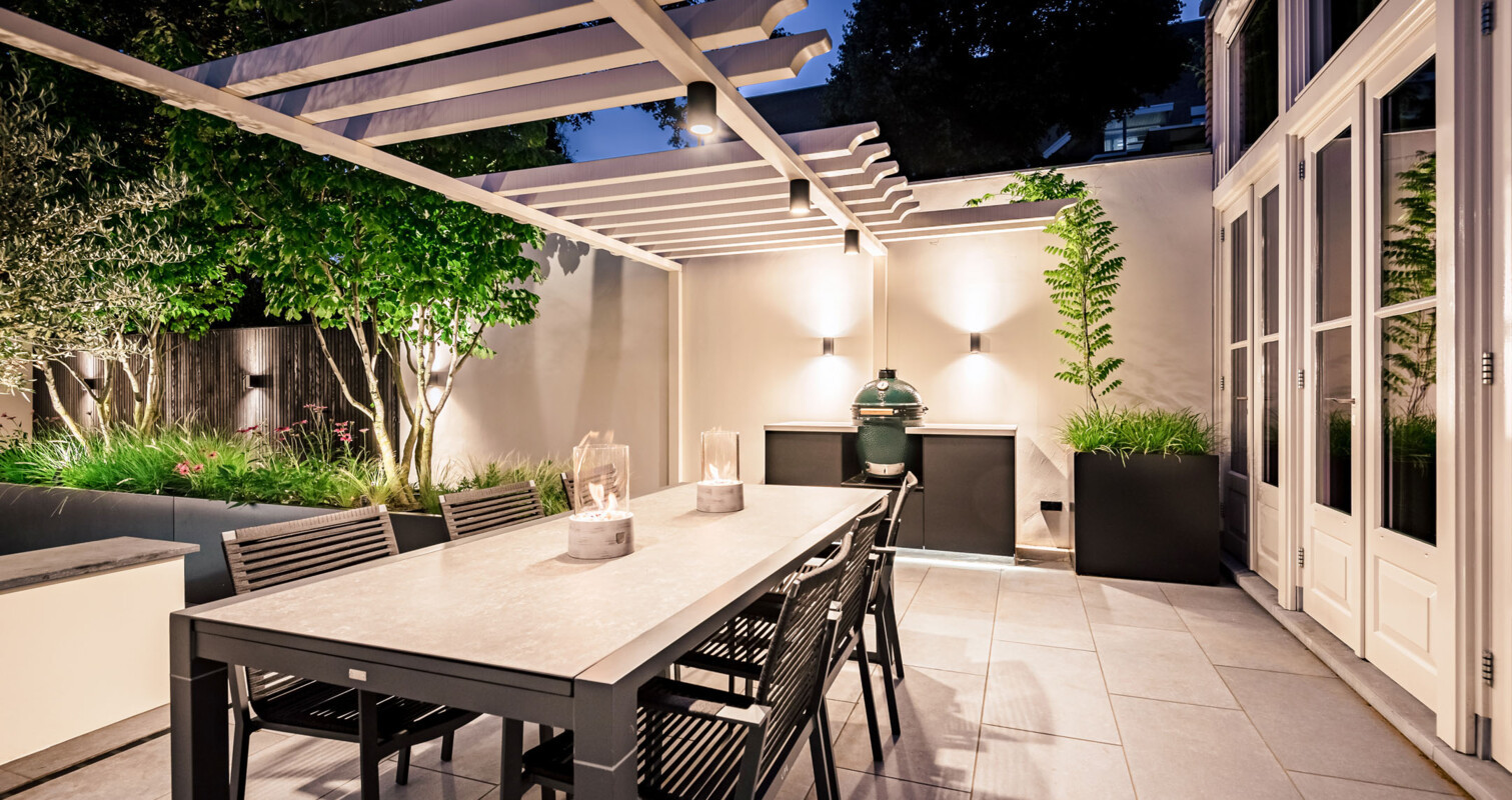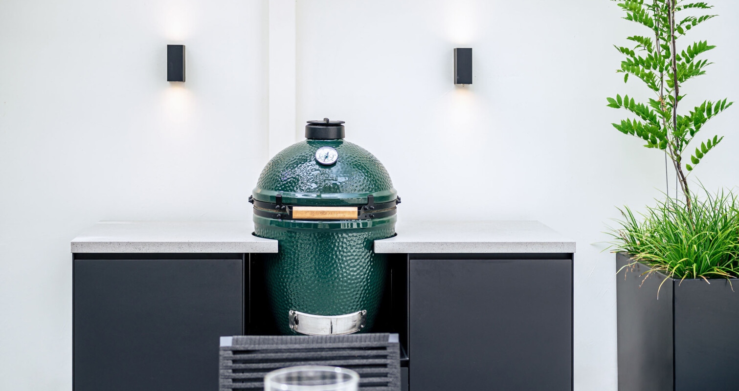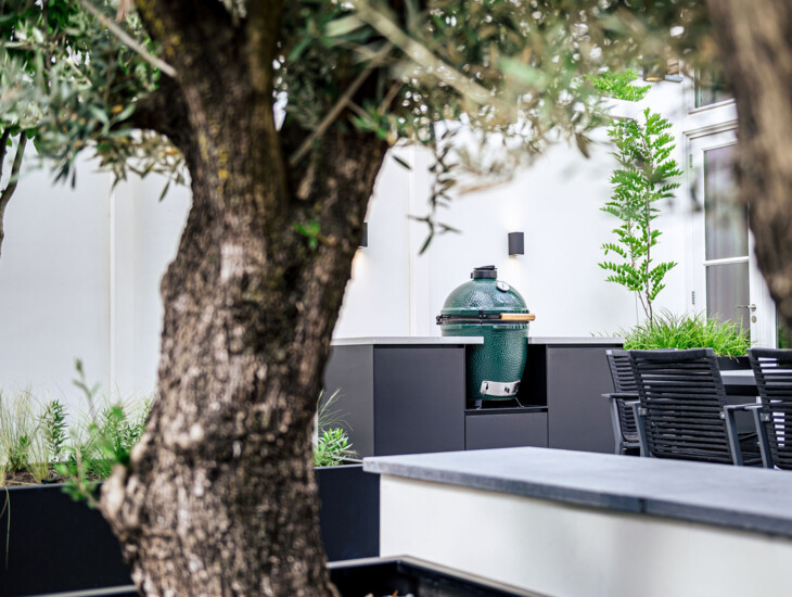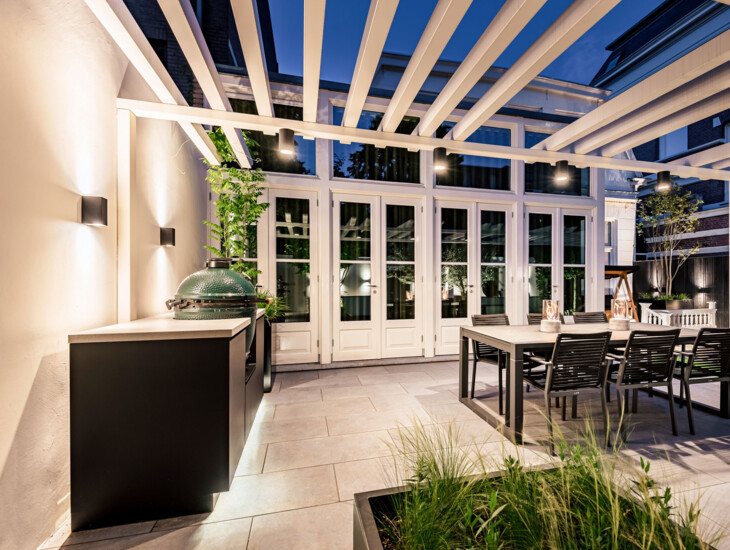 Bij de monumentale woning, in het hart van Groningen, heeft TIM Exclusive Gardens een hoogwaardige en comfortabele designtuin ontworpen. In het ontwerp van de tuin komen alle aspecten van een ultiem buitenleven samen. Centraal op het terras, bij de woning, heeft COOXS een comfortabele en compacte buitenkeuken gerealiseerd. In deze buitenkeuken staat de Big Green Egg barbecue centraal. Door de keuken subtiel uit te lichten met de up-down-spots op de achterwand en de led-strip bij de plint, straalt de keuken ook 's avonds een bijzondere sfeer uit.