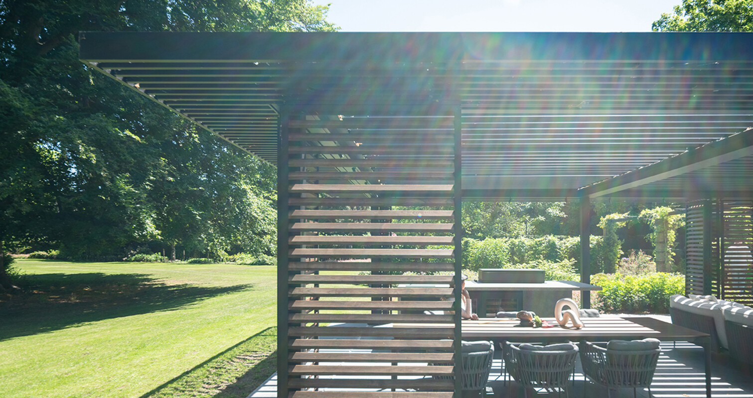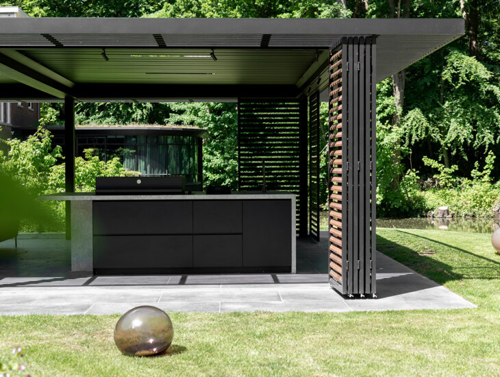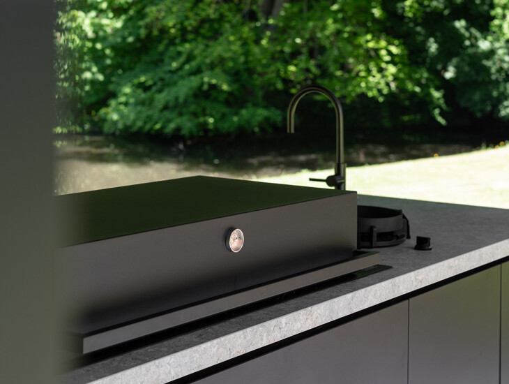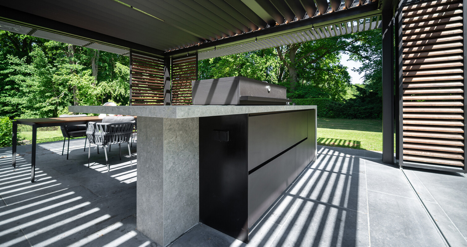 Om maximaal te kunnen genieten van de weelderige en landschappelijke tuin koos de klant voor een exclusieve tuinkamer van Veraluxe. Met deze tuinkamer als basis ontwierpen wij een centraal en luxueus eiland. In dit eiland integreerden we een breed scala aan comfortabele en luxueuze apparatuur. In het oog springend zijn de 2 elegante wijnkoelkasten van het Italiaanse merk Fhiaba. Verder is de buitenkeuken voorzien van een Fògher gasbarbecue, gaspit van PITT cooking en spoelbak met kraan. Door een slim en perfect uitgebalanceerd ontwerp komt al deze apparatuur het beste tot zijn recht en is het geheel ook een baken van modern design.