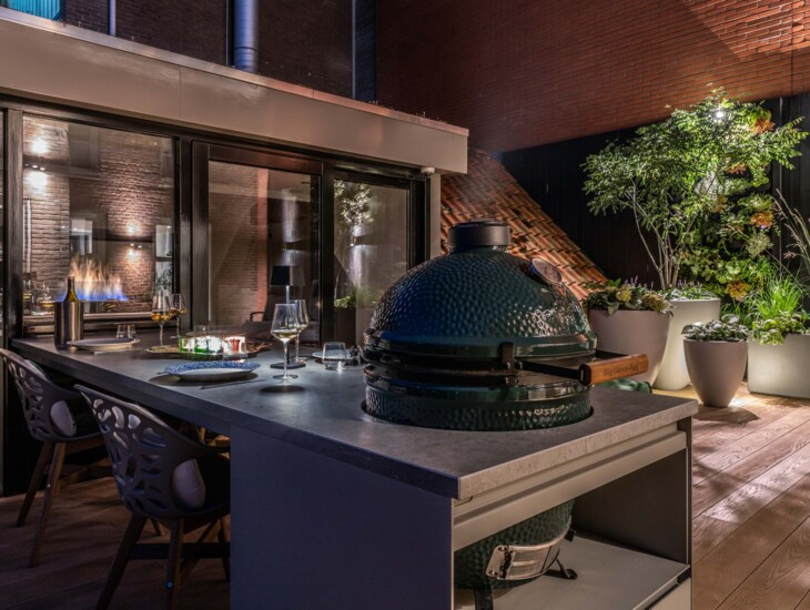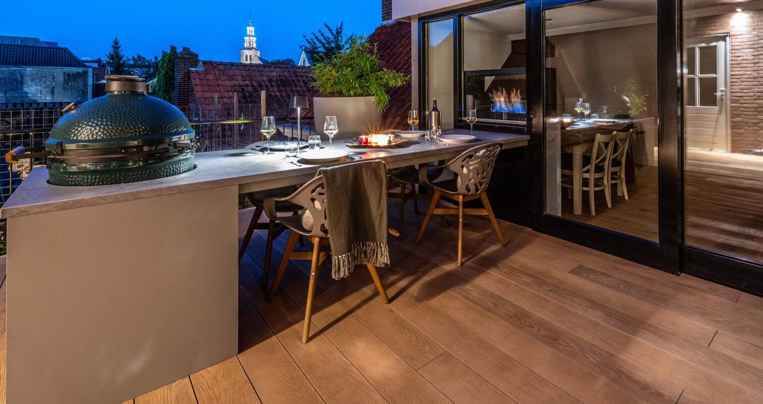 In dit ontwerp is de keuze gemaakt om de Big Green Egg aan de kopse kant van de buitentafel te plaatsen. Door de barbecue hier centraal te positioneren, blijft de chef altijd in verbinding met de gasten. Dit creëert niet alleen een uitnodigende plek op het dakterras, maar het vloeiende lijnenspel zorgt ook voor een visueel aantrekkelijk geheel. De strakke lijn van de buitentafel vloeit naadloos over in de tafel binnen, waardoor een harmonieus geheel ontstaat.