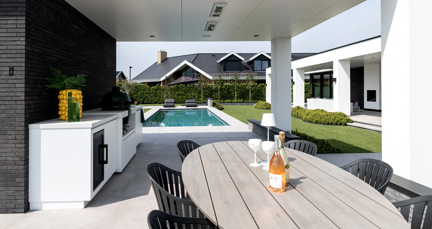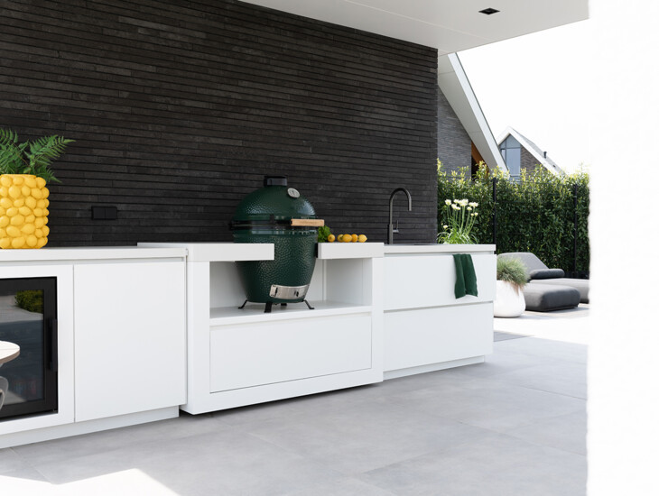 Bij het ontwerp van de COOXS buitenkeuken is rekening gehouden met zowel de architectuur van de woning als die van de tuin. De tijdloze witte kleurstelling is naadloos doorgetrokken en de verhoudingen van de buitenkeuken zijn in harmonie met die van het poolhouse.
