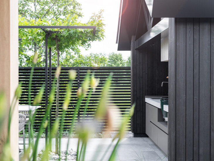 Een ontwerp wordt tijdloos door balans tussen kleuren, materialen en vormen. Dit ontwerp heeft die tijdloosheid, welke al begint bij de robuuste uitstraling van het buitenverblijf. Door dit ontwerp door te trekken in de keuken met een robuust werkblad ontstaat eenheid en tegelijkertijd wordt dit in balans gebracht door de warme, sfeervolle kleurstelling.