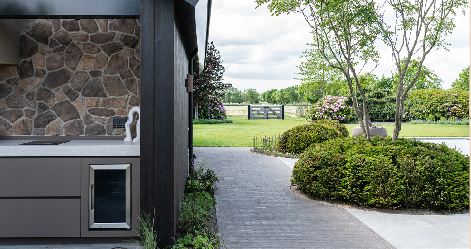 Op deze sfeervolle locatie op de Veluwe liet de klant een luxe tuin met karakteristiek buitenverblijf realiseren. Om zijn passie voor barbecueën naar een nieuw niveau te brengen ontwierpen en realiseerden we een luxe buitenkeuken als integraal onderdeel van het buitenverblijf. De buitenkeuken wordt gekenmerkt door een uitgebalanceerde symmetrie en de sfeervolle, mediterrane kleurstelling. Centraal staat de Big Green Egg Large opgesteld met voldoende werkruimte er omheen. Luxe apparatuur zoals de inductie kookplaat van Indu+, Caso koelkast en spoelbak met kraan zorgen dat het comfort compleet is.