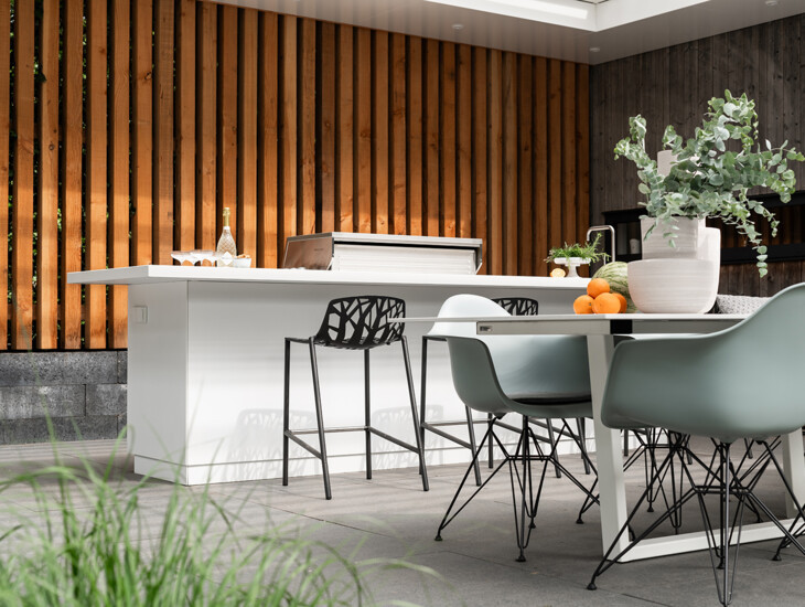 Bei COOXS legen wir großen Wert darauf, die Außenküche harmonisch in Ihr Gartendesign zu integrieren. Eine Küche ist schließlich kein isoliertes Element, sondern Teil des gesamten Gartenerlebnisses. Eine weiße Außenküche passt zu vielen Gartestilen. Haben Sie einen Ibiza-Garten mit vielen hellen Farbtönen oder eher einen Garten mit viel Grün? Es ist wichtig, den exakten Weißton genau auf den Stil Ihres Gartens abzustimmen, um das perfekte Endergebnis zu erzielen.