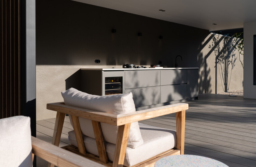 Centraal op het terras of geïntegreerd in een sfeervolle veranda – de Essence 300 buitenkeuken is een veelzijdige keuze die van elk terras een comfortabele uitvalsbasis maakt. De ruime lades en kasten bieden volop opbergruimte voor al uw benodigdheden en kunnen worden uitgebreid met luxe opties zoals een buitenkoelkast of inductiekookplaat.