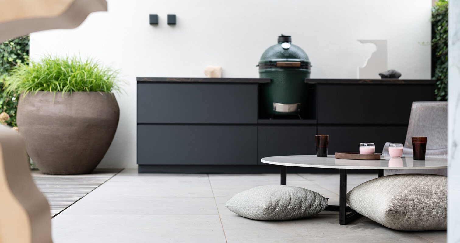 Het ontwerp van deze buitenkeuken wordt gekenmerkt door de typerende, elementaire balans. Centraal is de Big Green Egg Large opgesteld. De kasten van het meubel hebben een symmetrische vormgeving en zorgen zo ook voor rust en eenheid in het ontwerp.