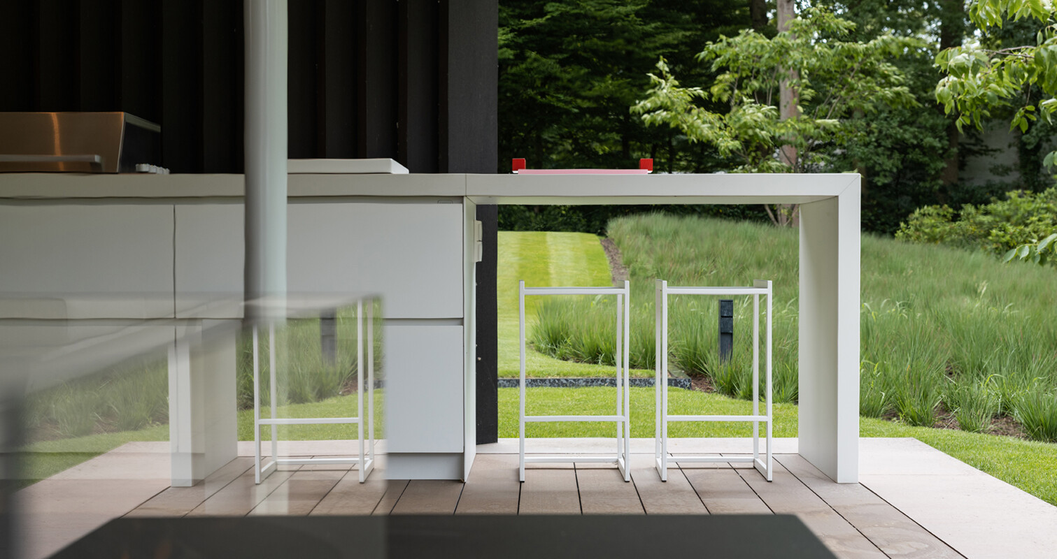 The timeless white outdoor kitchen blends harmoniously with its surroundings. Thanks to millimetre-precise customisation, it integrates perfectly into the architectural lines of the villa. In doing so, it strikes the ideal balance between comfort and design.