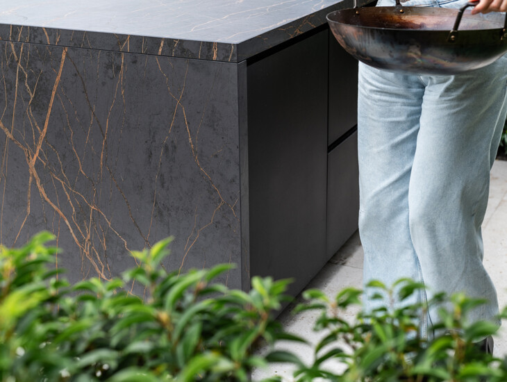 The outdoor kitchen is refined in its design, featuring dark cabinetry combined with the exclusive Dekton Laurent worktop. The integrated bar offers not only a cosy seating area but also adds a playful touch to the space. This kitchen is both functional and an architectural statement in the garden.
