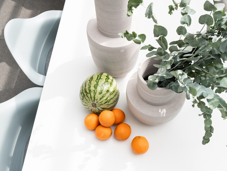 Modern and white: this COOXS outdoor kitchen is a striking element on this high-quality designed terrace. The luxurious outdoor kitchen is equipped with a comfortable gas barbecue, outdoor refrigerator, and sink with faucet. By designing the model with a bar, friends and family can easily gather, bringing enjoyment within reach.