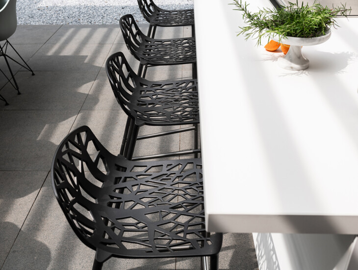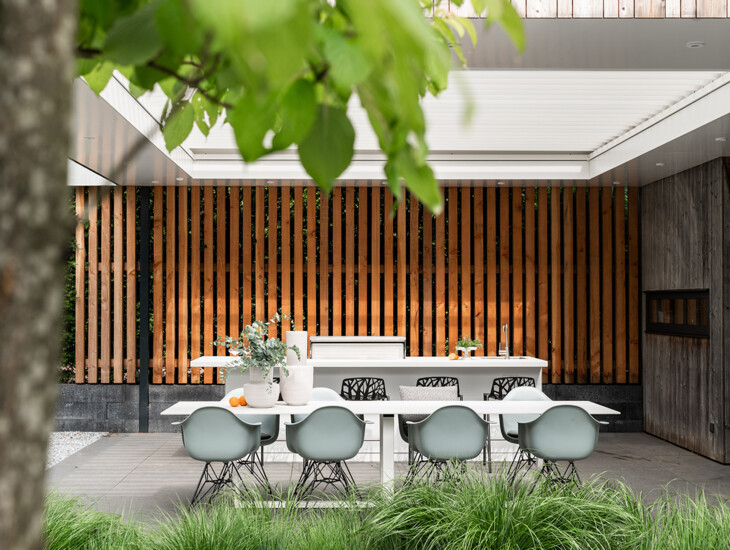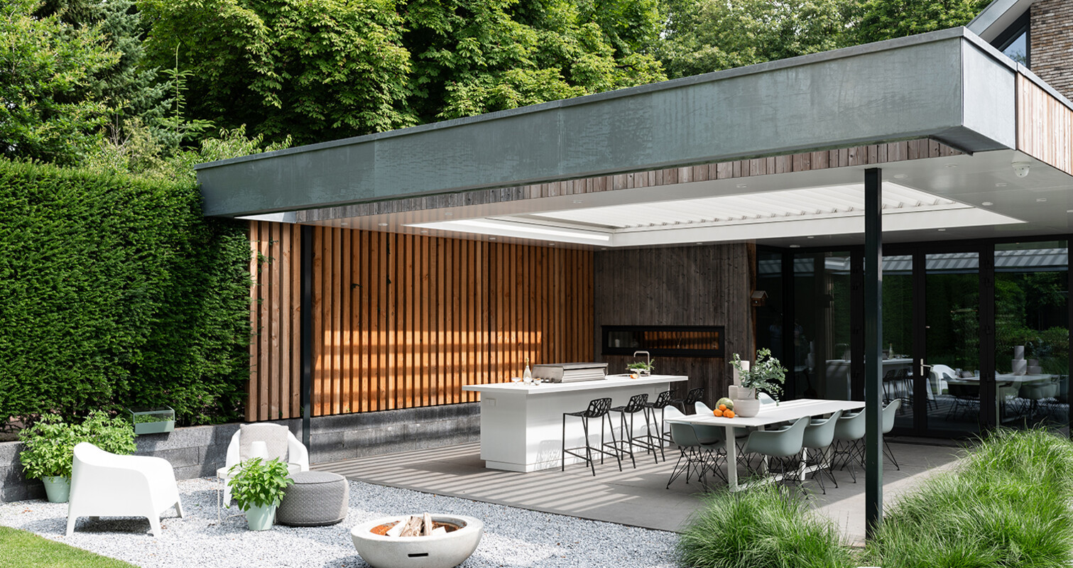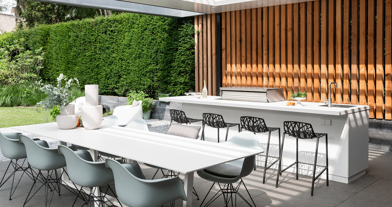The residents of this forest villa in Oosterbeek are true enthusiasts of modern design. This is evident in their home, and they wanted to extend it to the outdoors. They succeeded in doing so with the modern, white outdoor kitchen. The white is balanced by the wooden backdrop and black bar stools, creating an elegant and timeless overall look.